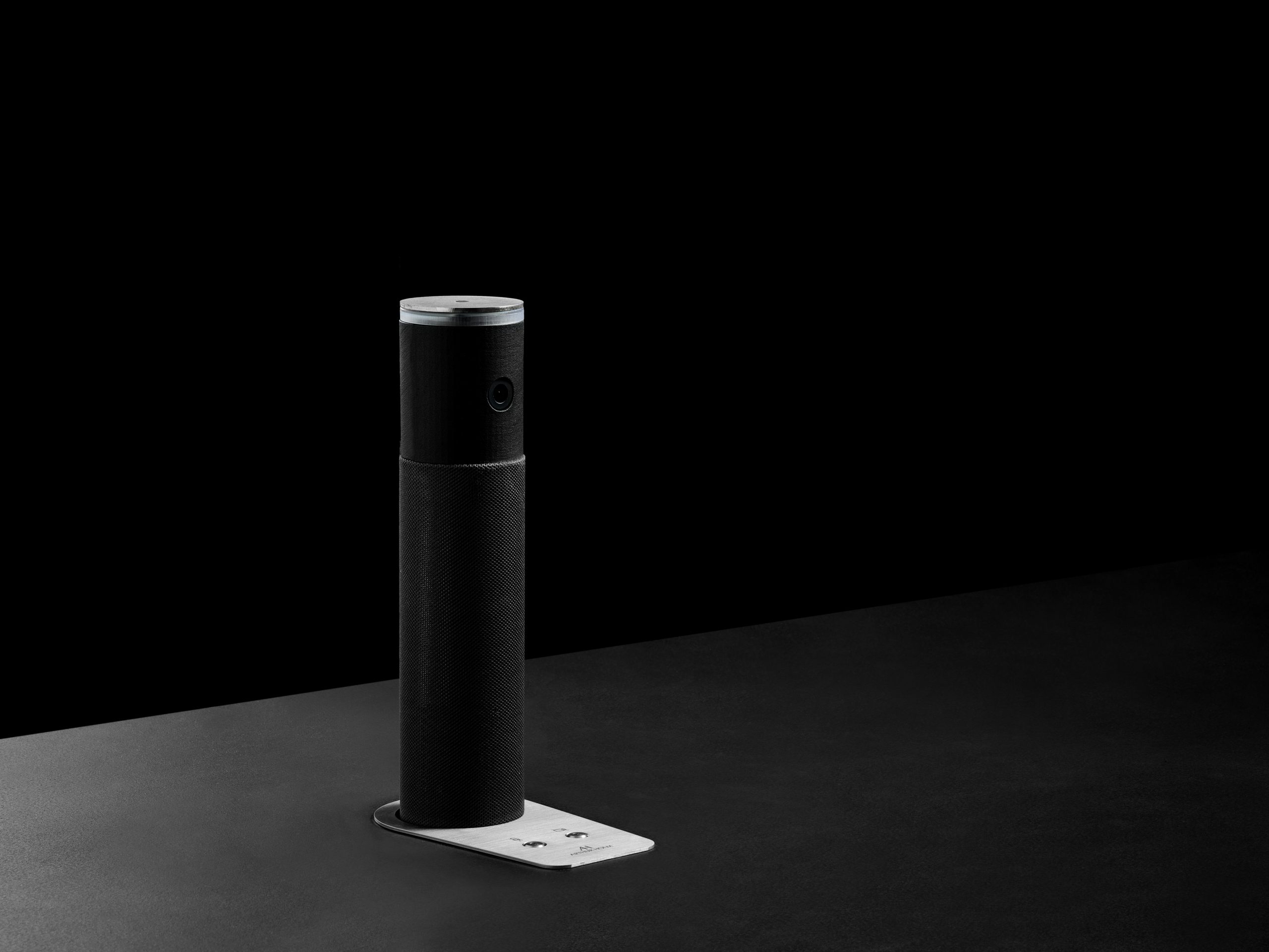 State-of-the-art motorized HD-SDI video camera, microphone, and loudspeaker system, seamlessly designed for furniture integration. Encased in a sleek, black, non-reflective matte finish crafted from steel and composite materials, this system is as durable as it is discreet.
